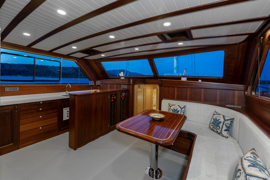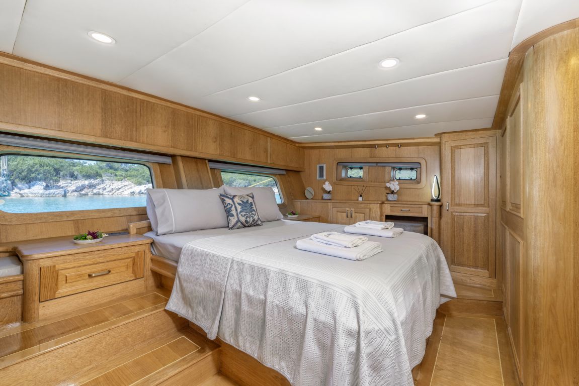 | Può ospitare fino a 8 persone: 2 cabine armatoriali, 1 cabina doppia, 1 cabina doppia, box doccia e servizi igienici in tutte le cabine, cabine equipaggio separate. |