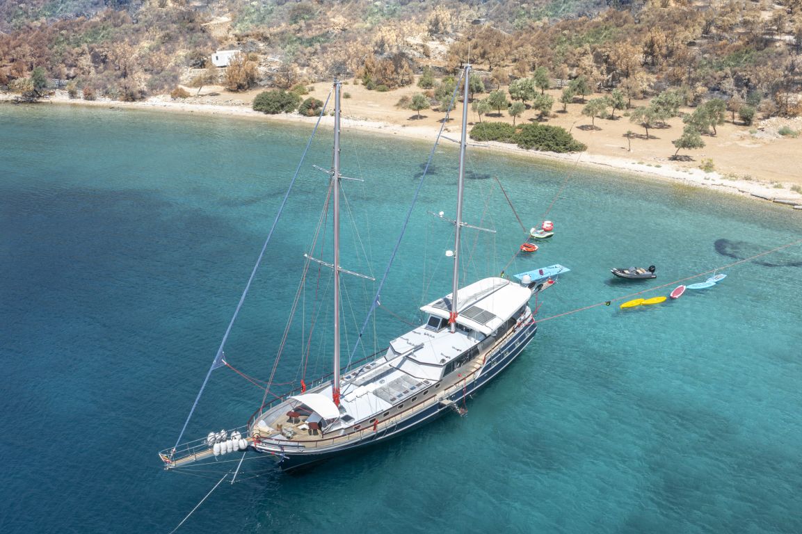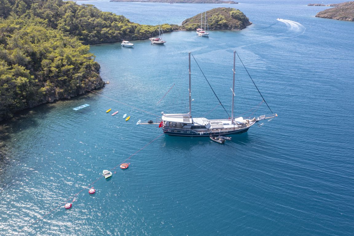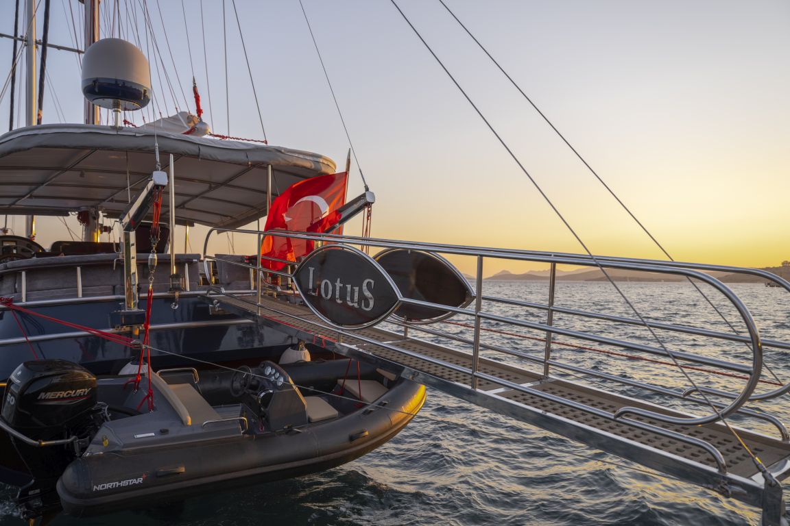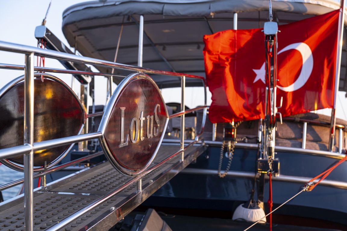 ognuna con doccia privata, WC e aria condizionata. È equipaggiata con 2 motori MAN da 450 CV e 2 generatori Kohler da 24 kW. Sono disponibili zone giorno separate per l'equipaggio, una cucina completamente attrezzata, zone pranzo interne ed esterne, aria condizionata 24 ore su 24, aree relax e un bar americano. Sono presenti cuscini prendisole, sedie e set di cortesia per tutti gli ospiti. Questo yacht, che offre comfort, lusso e tranquillità ai nostri ospiti di crociera blu, può raggiungere una velocità fino a 10 miglia nautiche. Grazie ai sistemi wireless, telefonici GSM e di navigazione completamente attrezzati, vi sentirete al sicuro durante la crociera a bordo dello yacht Lotus nelle destinazioni più ambite per le crociere blu, come Bodrum, Marmaris, Fethiye e Gocek. Inoltre, nel salone sono disponibili TV LCD, lettore DVD e impianto stereo per i nostri stimati ospiti. Per non disconnettersi dalla vita online durante la vacanza, il nostro yacht è dotato di connessione Wi-Fi valida nelle acque territoriali turche. Per gli ospiti che lo desiderano, sono disponibili, a richiesta, sport acquatici come wakeboard, sci nautico, canoa e Hobie Mirage. Per i nostri ospiti che desiderano godersi la crociera blu nelle baie incontaminate della Turchia, il nostro materassino gonfiabile offre un'ulteriore opportunità di intrattenimento.