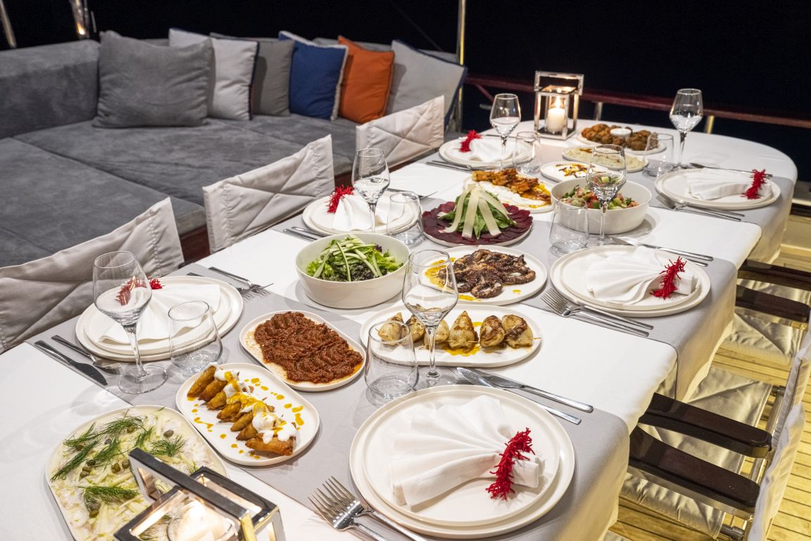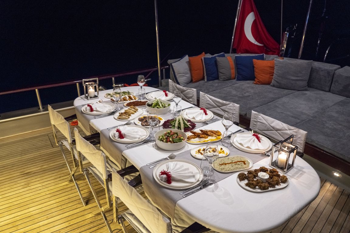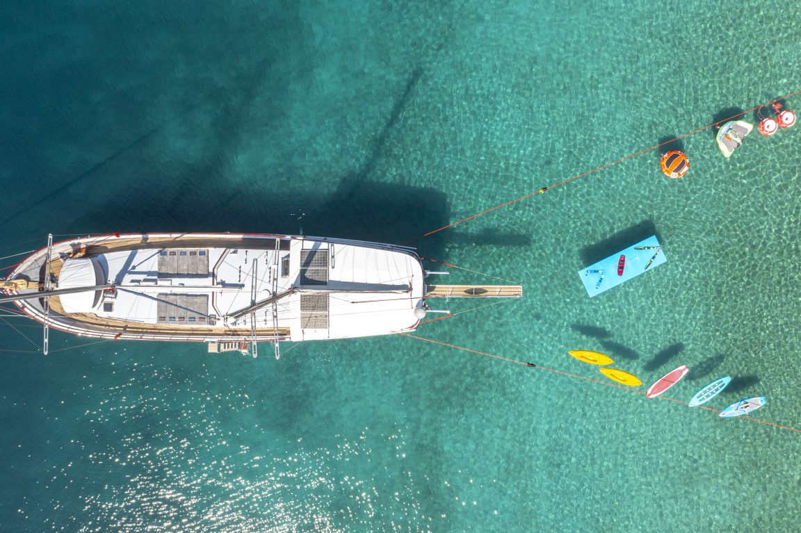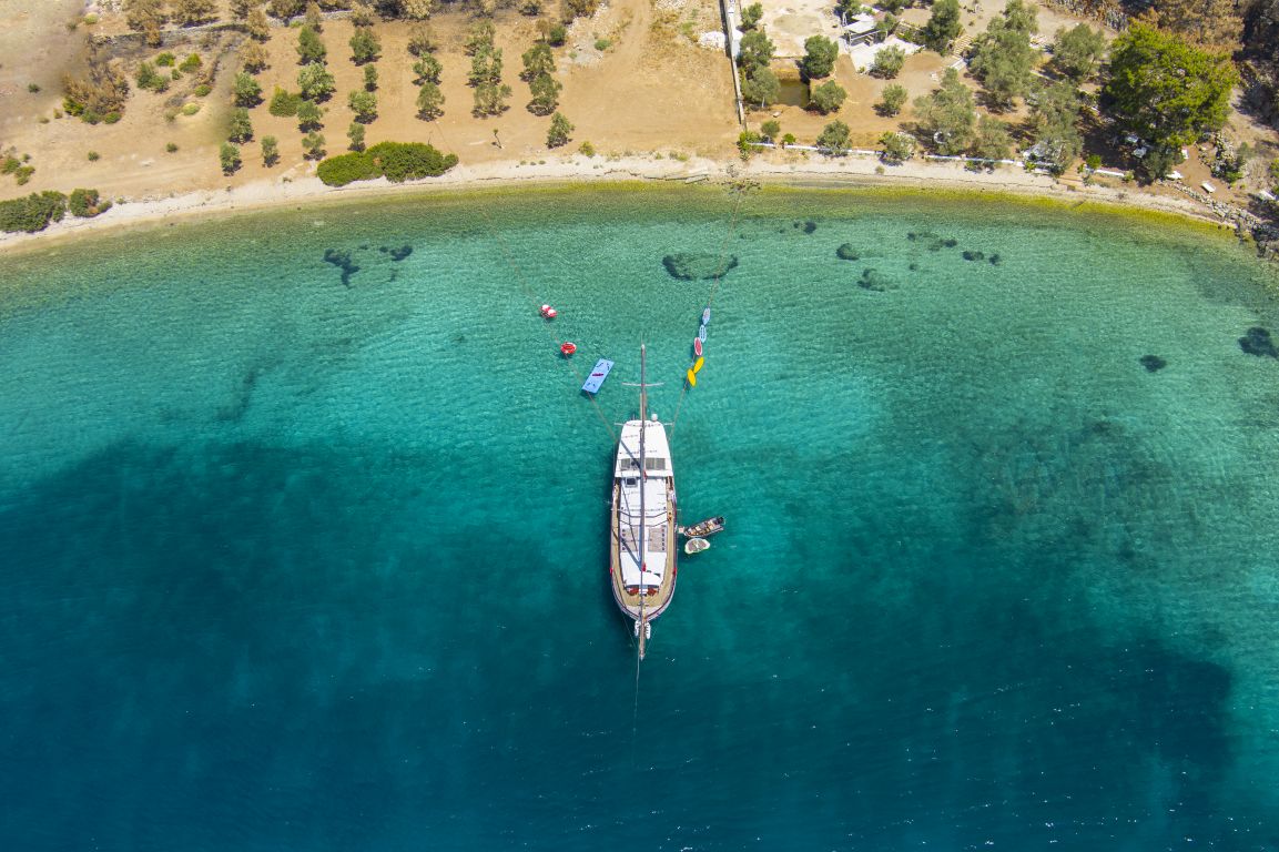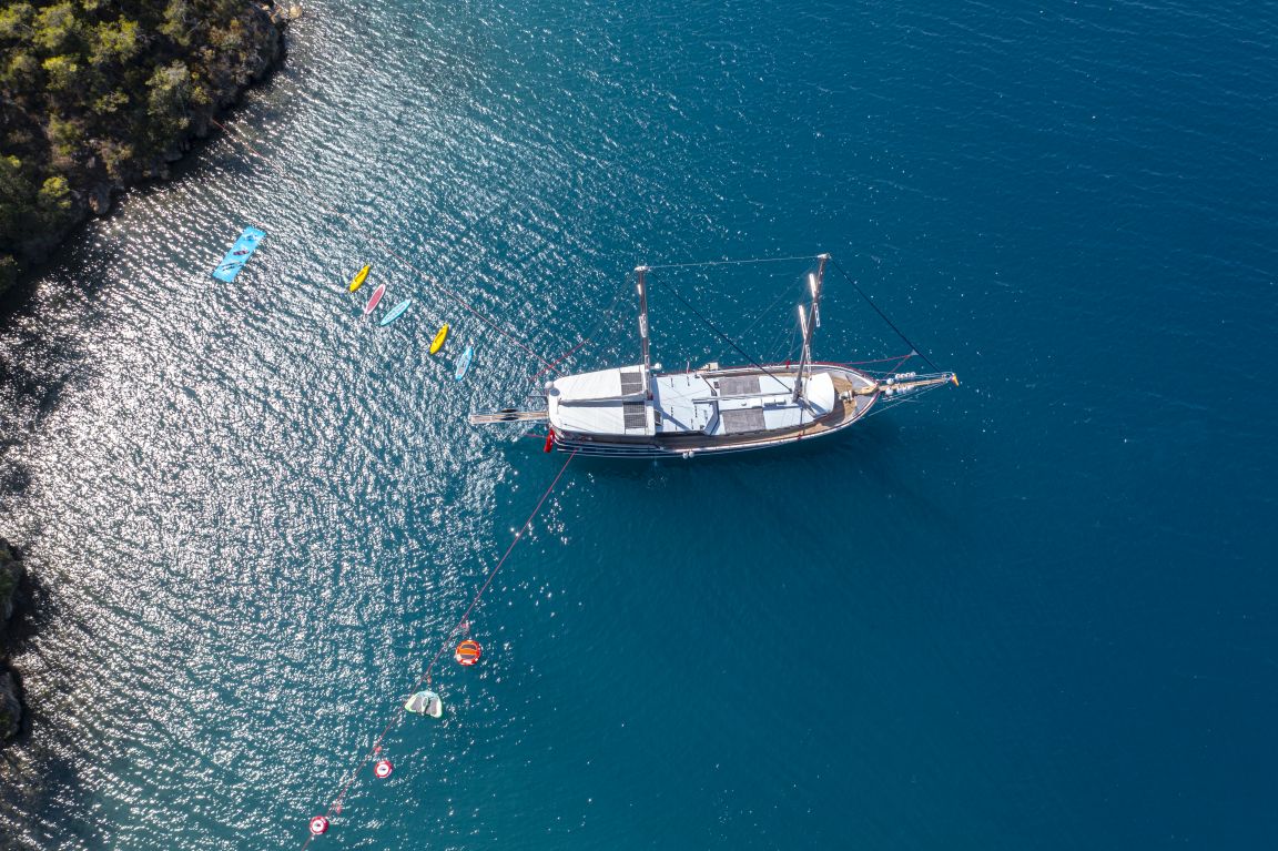 ognuna con doccia privata, WC e aria condizionata. È equipaggiata con 2 motori MAN da 450 CV e 2 generatori Kohler da 24 kW. Sono disponibili zone giorno separate per l'equipaggio, una cucina completamente attrezzata, zone pranzo interne ed esterne, aria condizionata 24 ore su 24, aree relax e un bar americano. Sono presenti cuscini prendisole, sedie e set di cortesia per tutti gli ospiti. Questo yacht, che offre comfort, lusso e tranquillità ai nostri ospiti di crociera blu, può raggiungere una velocità fino a 10 miglia nautiche. Grazie ai sistemi wireless, telefonici GSM e di navigazione completamente attrezzati, vi sentirete al sicuro durante la crociera a bordo dello yacht Lotus nelle destinazioni più ambite per le crociere blu, come Bodrum, Marmaris, Fethiye e Gocek. Inoltre, nel salone sono disponibili TV LCD, lettore DVD e impianto stereo per i nostri stimati ospiti. Per non disconnettersi dalla vita online durante la vacanza, il nostro yacht è dotato di connessione Wi-Fi valida nelle acque territoriali turche. Per gli ospiti che lo desiderano, sono disponibili, a richiesta, sport acquatici come wakeboard, sci nautico, canoa e Hobie Mirage. Per i nostri ospiti che desiderano godersi la crociera blu nelle baie incontaminate della Turchia, il nostro materassino gonfiabile offre un'ulteriore opportunità di intrattenimento.