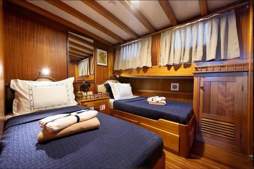 | capacità fino a 12 ospiti; 3 cabine matrimoniali, 3 cabine doppie, box doccia e servizi igienici di tipo domestico in tutte le cabine, cabine equipaggio separate. |