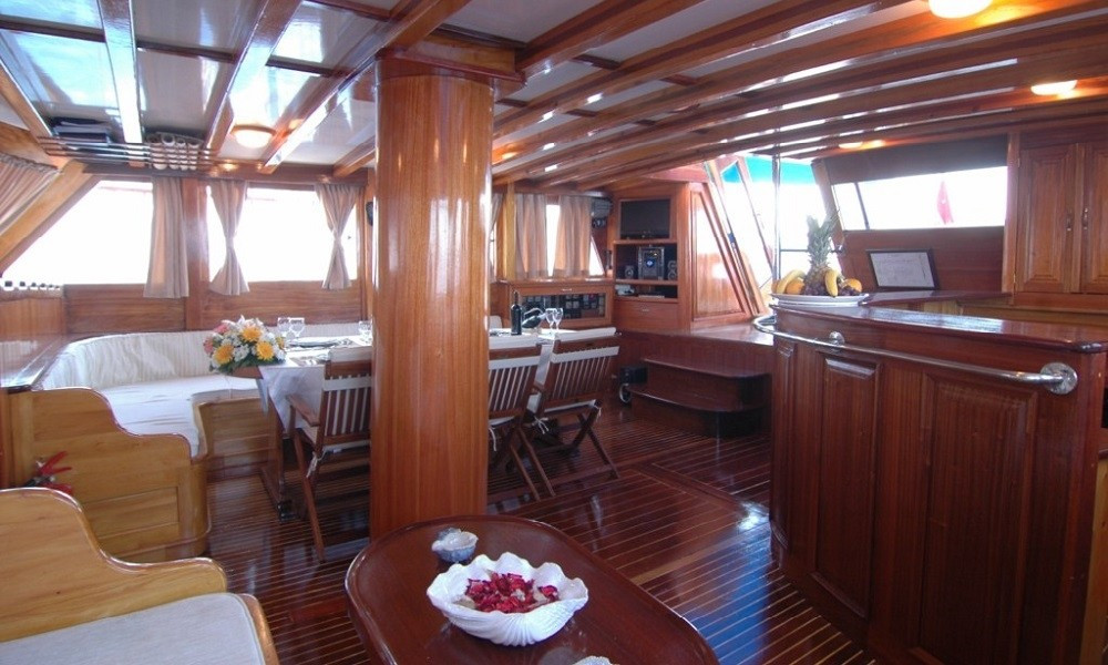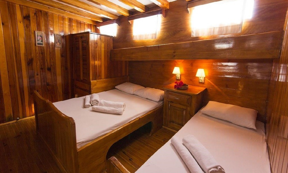 | Può ospitare fino a 18 ospiti: 4 cabine triple, 3 cabine doppie, box doccia e servizi igienici in tutte le cabine, cabine equipaggio separate. |