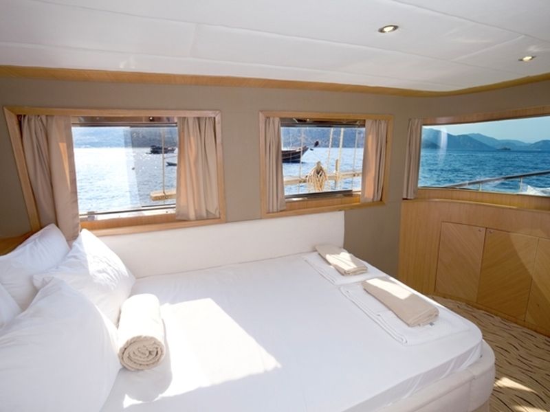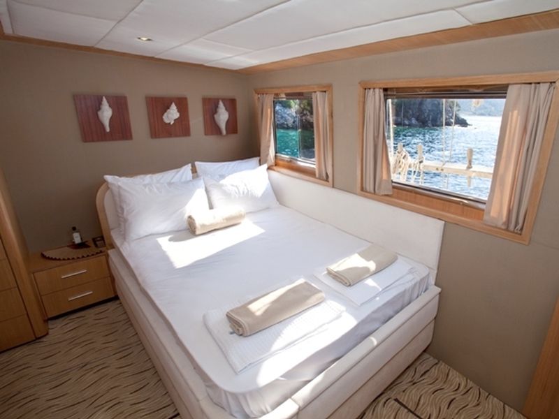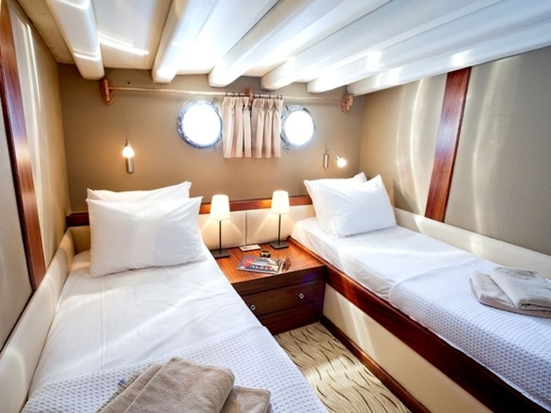Il nostro caicco da 8 cabine ha 2 cabine master, 2 doppie e 4 twin, con aria condizionata, servizi igienici e doccia in ogni cabina e può ospitare facilmente un totale di 20 ospiti. L'ampio e confortevole soggiorno è dotato di attrezzature come TV, TV satellitare e lettore CD per rendere più piacevole il tuo tempo fuori dal mare. Mentre ti godi i pasti preparati nella nostra cucina completamente attrezzata, puoi anche scoprire ogni sfumatura di blu.