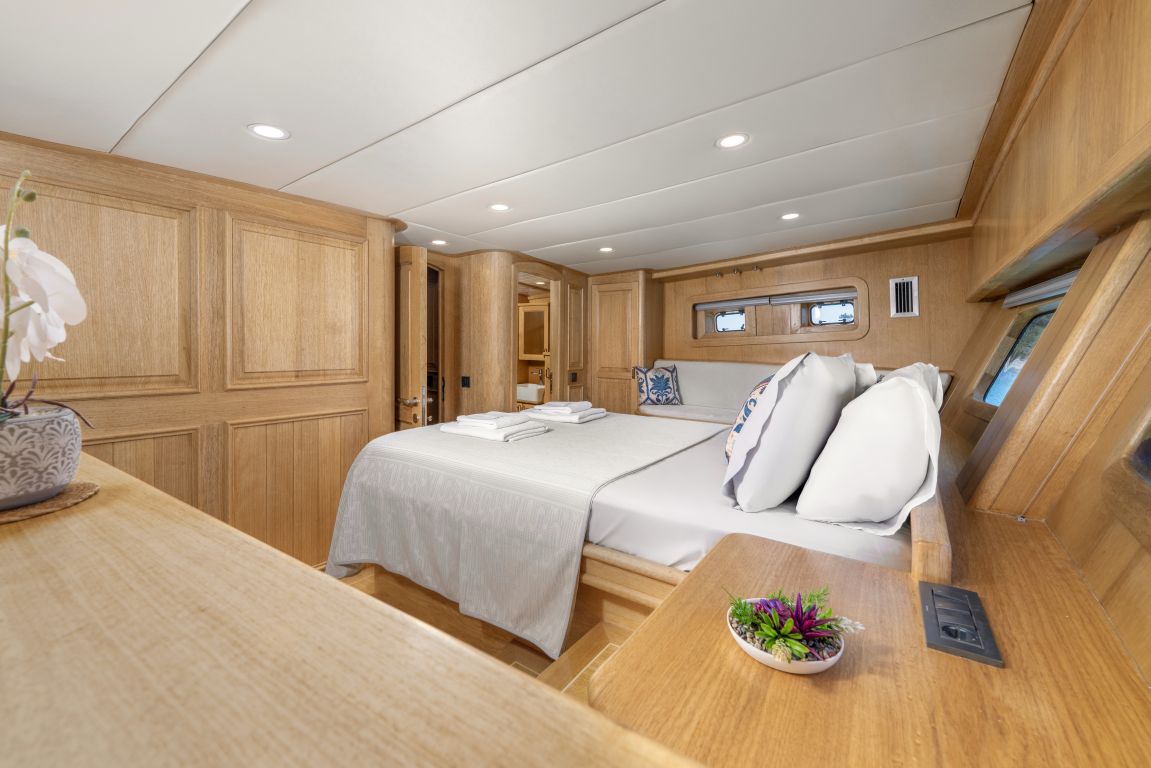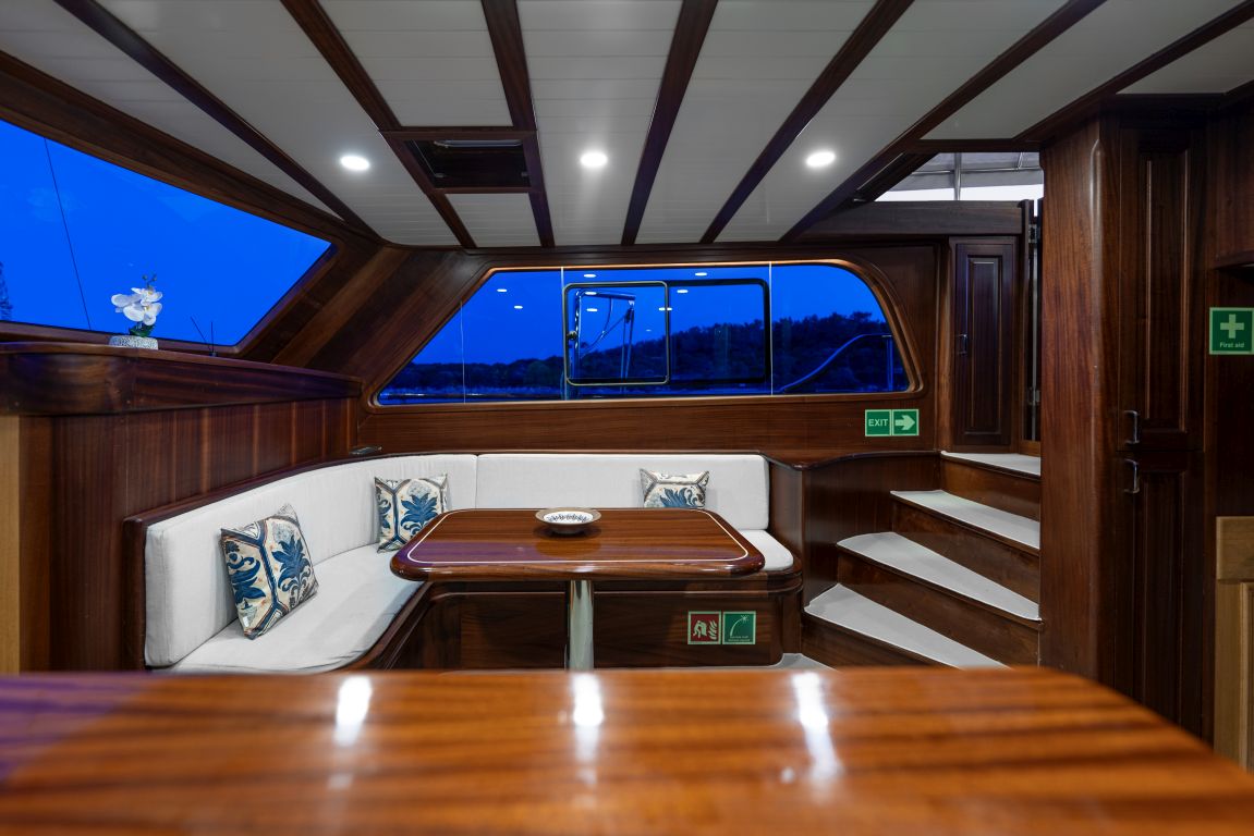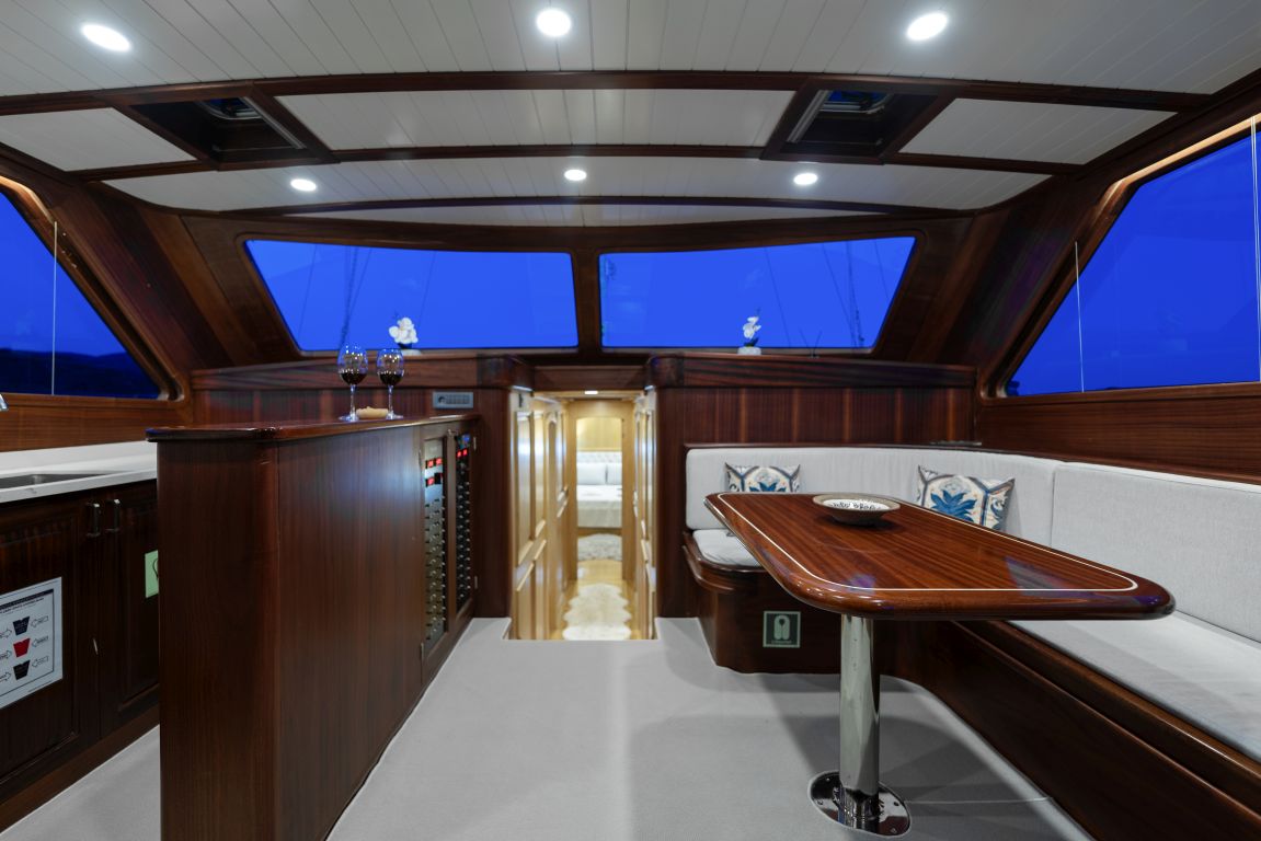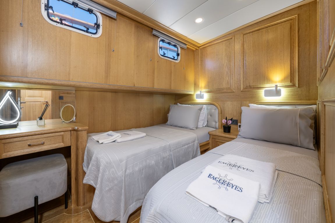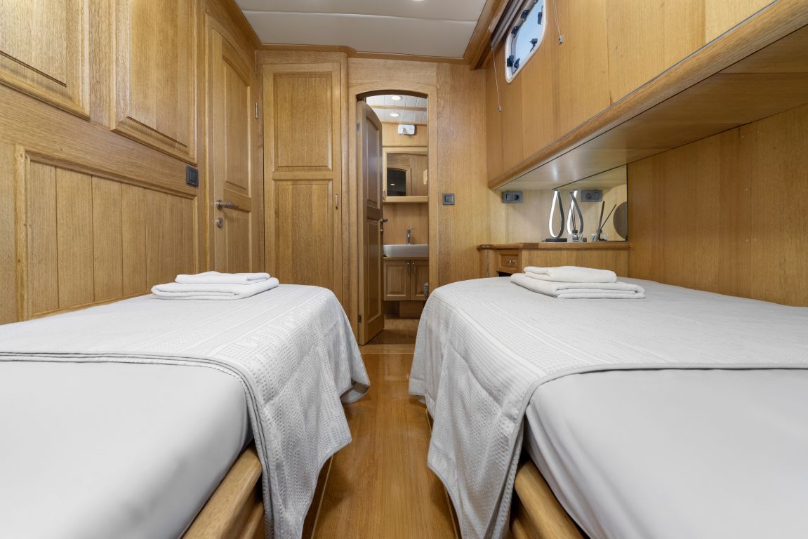 | Può ospitare fino a 8 persone: 2 cabine armatoriali, 1 cabina doppia, 1 cabina doppia, box doccia e servizi igienici in tutte le cabine, cabine equipaggio separate. |