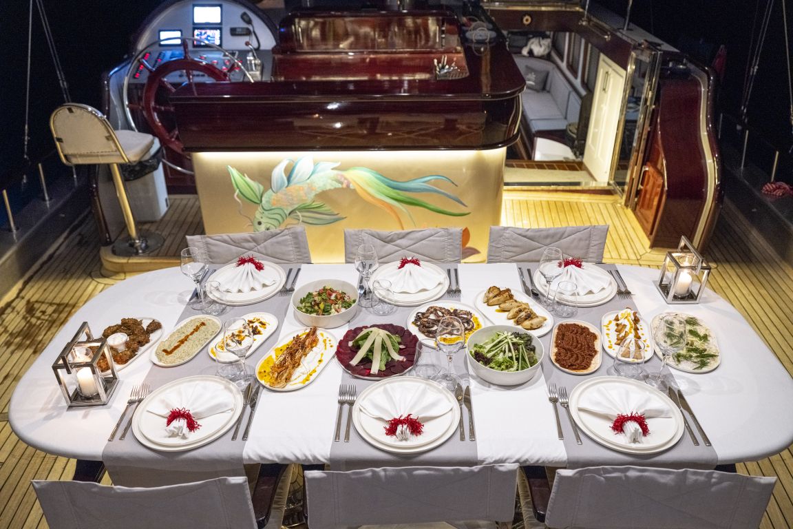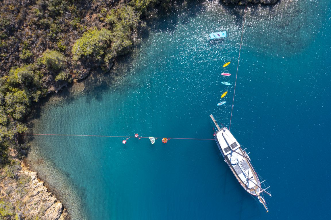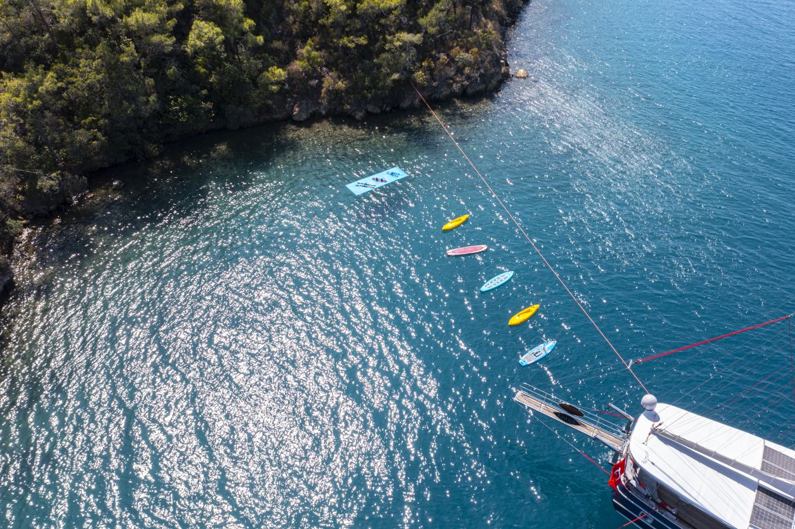 ognuna con doccia privata, WC e aria condizionata. È equipaggiata con 2 motori MAN da 450 CV e 2 generatori Kohler da 24 kW. Sono disponibili zone giorno separate per l'equipaggio, una cucina completamente attrezzata, zone pranzo interne ed esterne, aria condizionata 24 ore su 24, aree relax e un bar americano. Sono presenti cuscini prendisole, sedie e set di cortesia per tutti gli ospiti. Questo yacht, che offre comfort, lusso e tranquillità ai nostri ospiti di crociera blu, può raggiungere una velocità fino a 10 miglia nautiche. Grazie ai sistemi wireless, telefonici GSM e di navigazione completamente attrezzati, vi sentirete al sicuro durante la crociera a bordo dello yacht Lotus nelle destinazioni più ambite per le crociere blu, come Bodrum, Marmaris, Fethiye e Gocek. Inoltre, nel salone sono disponibili TV LCD, lettore DVD e impianto stereo per i nostri stimati ospiti. Per non disconnettersi dalla vita online durante la vacanza, il nostro yacht è dotato di connessione Wi-Fi valida nelle acque territoriali turche. Per gli ospiti che lo desiderano, sono disponibili, a richiesta, sport acquatici come wakeboard, sci nautico, canoa e Hobie Mirage. Per i nostri ospiti che desiderano godersi la crociera blu nelle baie incontaminate della Turchia, il nostro materassino gonfiabile offre un'ulteriore opportunità di intrattenimento.