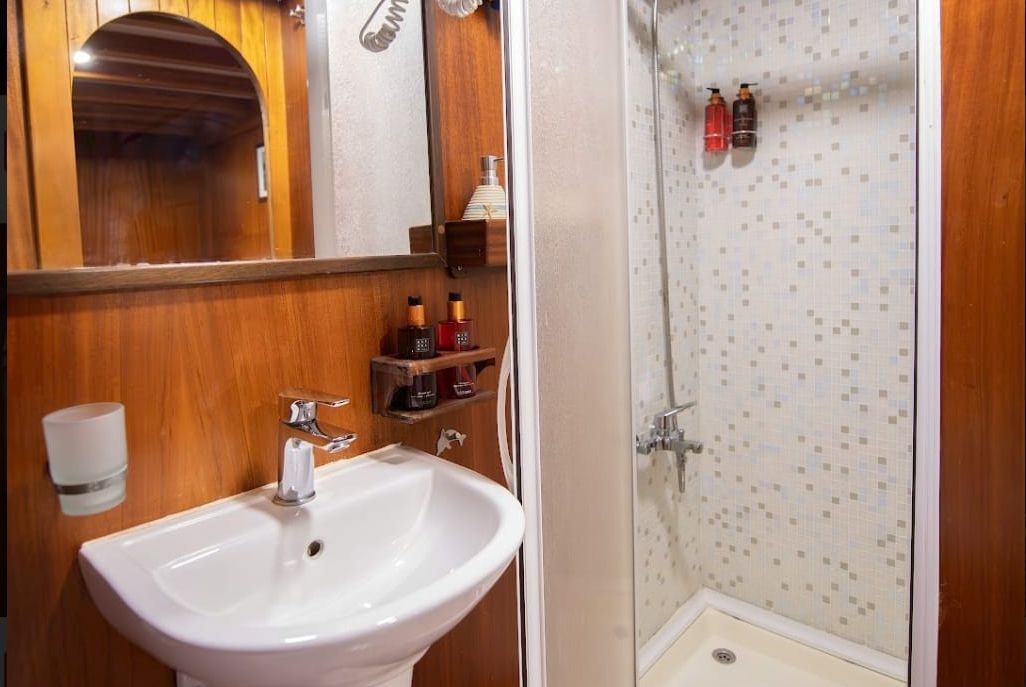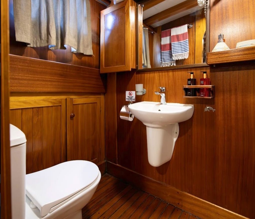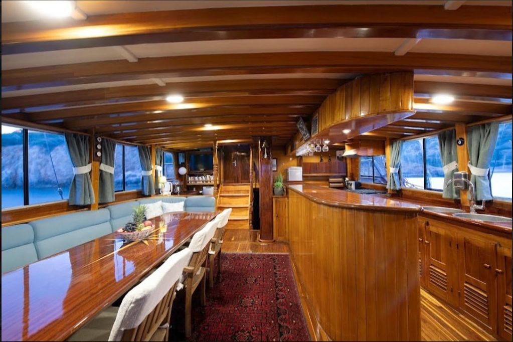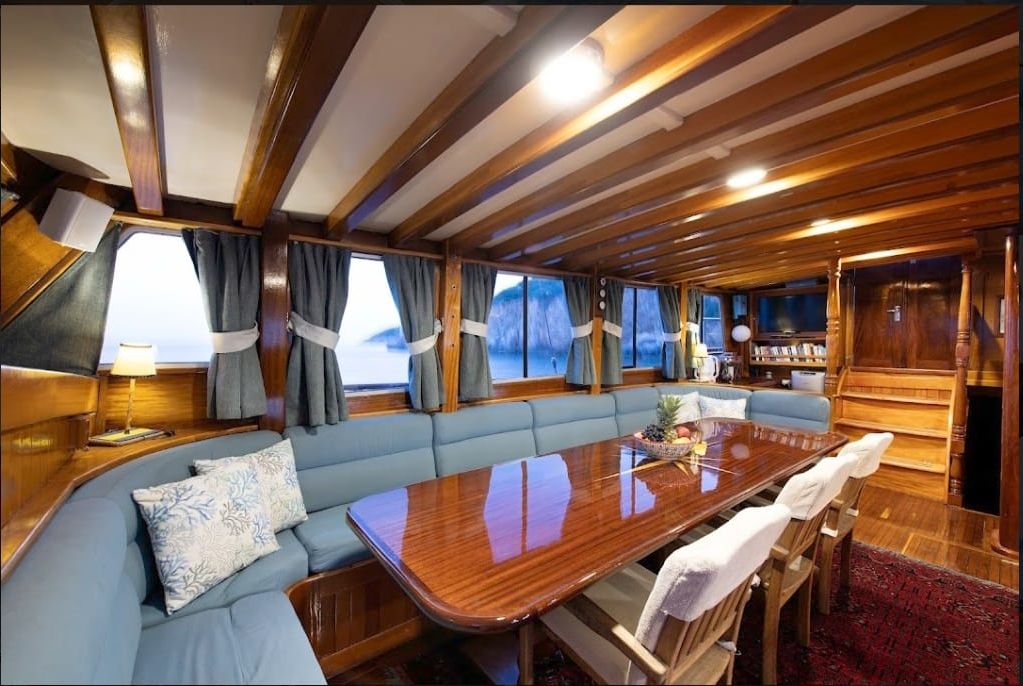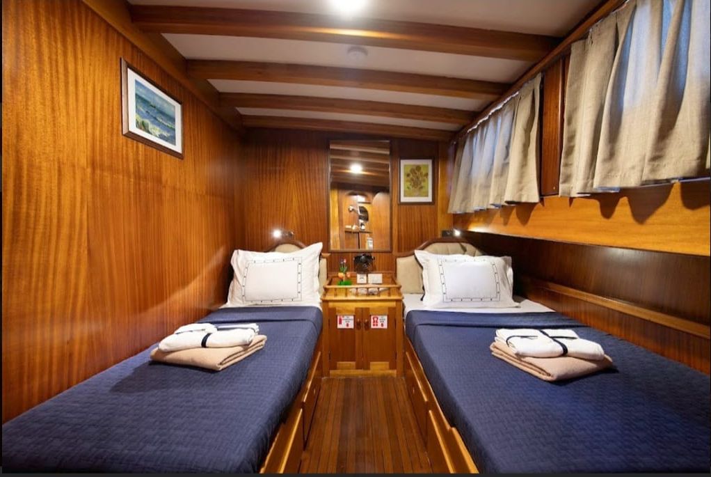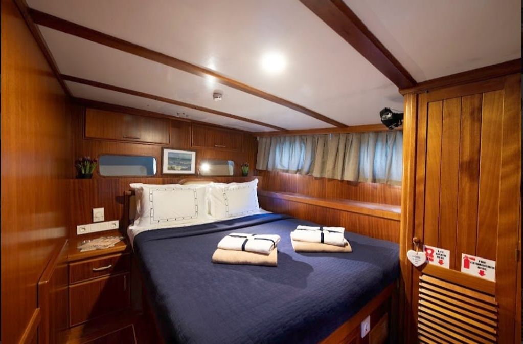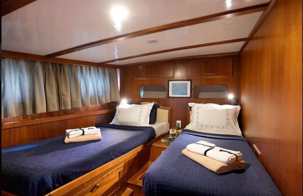 | capacità fino a 12 ospiti; 3 cabine matrimoniali, 3 cabine doppie, box doccia e servizi igienici di tipo domestico in tutte le cabine, cabine equipaggio separate. |